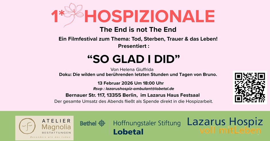 Dieses Jahr wird der Dokumentarfilm: „So Glad I Did“ im Festsaal des Lazarus Hauses gezeigt. Um Anmeldung wird gebeten an: lazarushospiz-ambulant@lobetal.de.